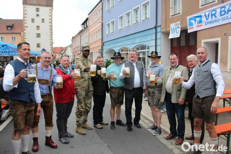 Wie immer hatten die vielen fleißigen Helfer des Musikvereins den Vilsecker Marktplatz ab Samstagvormittag in einen großen Biergarten verwandelt und eine Bühne samt Überdachung und Essensständen aufgebaut. Bereits beim Bieranstich, den Bürgermeister Hans-Martin Schertl zusammen mit einigen US-Kommandeuren aus Vilseck und Grafenwöhr vornahm, war der Marktplatz schon gut besetzt. Der Vorsitzende des Musikverein, Christian Winklmann, freute sich, zum 43. Brunnenfest neben viel politischer Prominenz und der Geistlichkeit auch viele amerikanische Gäste begrüßen zu können. "Ziel des Musikvereins ist es, den Festbesuchern ein vielfältiges musikalisches Unterhaltungsprogramm anbieten zu können", sagte er.