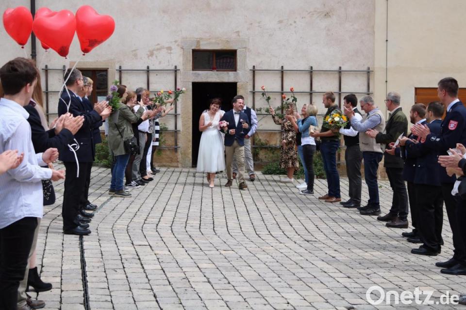 Auf der Burg Dagestein besiegelte am Samstag Bürgermeister Hans-Martin Schertl dem Paar den Ehebund. Als Gäste waren die engsten Familienmitglieder in gehörigem Abstand dabei. Familie, Freunde, Jagdgenossen und Abordnungen der Unterstützungsgruppe örtliche Einsatzleitung des Landkreises und der Feuerwehr Hahnbach ließen es sich nicht nehmen für ihren Freund und seiner frisch vermählten Gattin Ehrenspalier zu stehen und zu gratulieren.