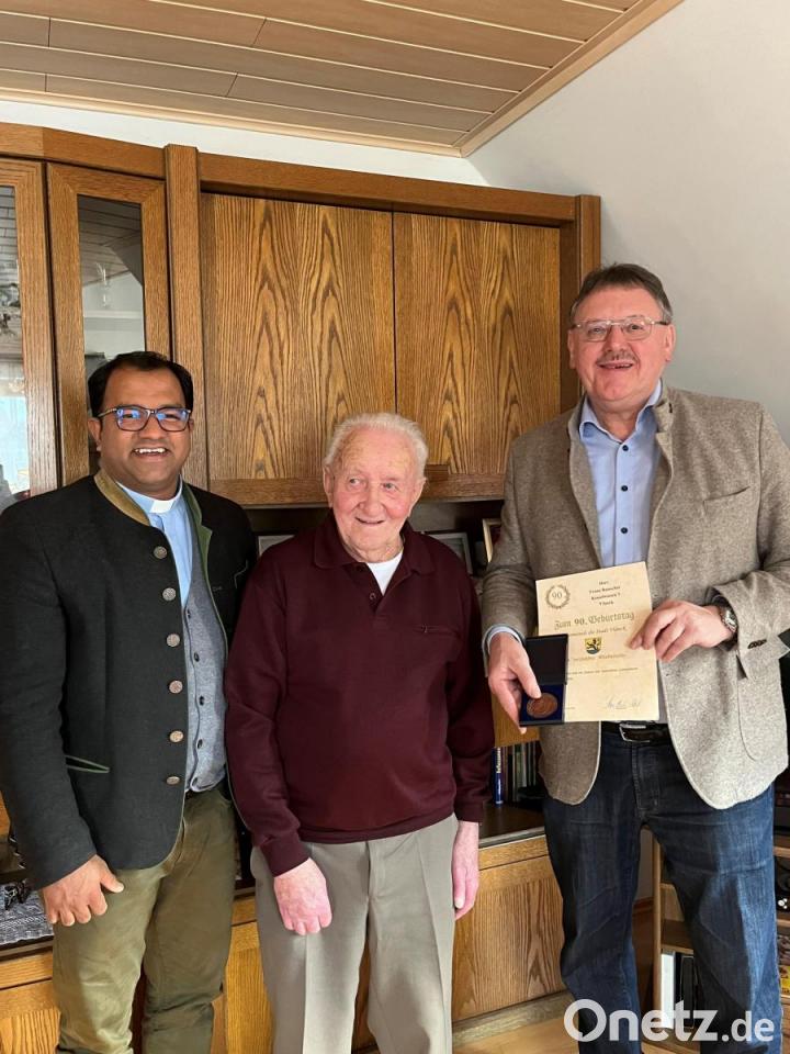 Die Glückwünsche der Pfarrei zum runden Geburtstag von Franz Rauscher übermittelte Stadtpfarrer Pater Robin. Rauscher stammt aus Freihung und ist dort mit zwei Geschwistern aufgewachsen. Da er seine Mutter früh verlor, war er schon bald auf sich alleine gestellt. Nach der Schule arbeitete er bei den Porphyr-Werken in Freihung im sogenannten Farbenraum. Die letzten zehn Jahre bis zur Rente war er im Sägewerk Schmid in Vilseck beschäftigt. Mit seiner Frau Helene, die bereits verstorben ist, wohnte Rauscher die ersten Jahre nach der Hochzeit in Freihung, später zog das Ehepaar nach Vilseck zurück. Vor 20 Jahren bauten sich die Eheleute mit ihrer Tochter und deren Familie ein Haus. Das Ehepaar Rauscher bekam drei Kinder, von denen eines bereits in sehr jungen Jahren verstarb. Inzwischen freut sich der Großvater über acht Enkel und drei Urenkel. Auch zwei Nichten aus Ingolstadt reisten extra zum Ehrentag ang. Franz Rauscher kümmert sich noch selbst um seinen Haushalt und kocht sich auch sein Mittagessen, am liebsten ein Wiener Schnitzel. Der Jubilar hält sich gern in seinem Garten auf, die schweren Arbeiten überlässt er aber mittlerweile der jüngeren Generation.