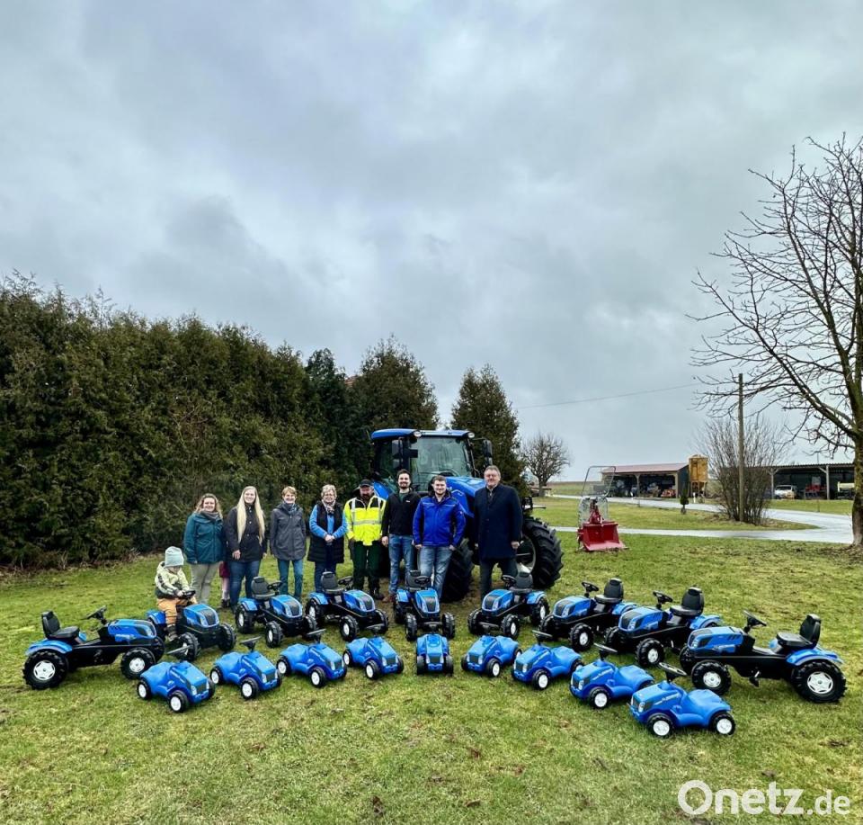 Einen tollen Anblick bot der Fuhrpark, den die Familie Näger am Schöfelhof aufgebaut hatte. Neun blaue Tretbulldogs und neun blaue Rutscherfahrzeuge im Traktorenlook waren vor einem Original-Bulldog aufgereiht und erwarteten die neuen Besitzer. Die Familie Näger hatte eine Mahnwache am Axtheid-Berg anlässlich der Proteste der Landwirte organisiert. Die Veranstaltung übertraf mit rund 500 Teilnehmern und 350 Fahrzeugen alle Erwartungen. Die Kirwagemeinschaft Axtheid-Berg sorgte für die Bewirtung und erzielte einen Erlös von knapp 2000 Euro. Dieser soll nun in Form der Kinderfahrzeuge den drei örtlichen Kindergärten zugute kommen. Die beiden Vorsitzenden der Kirwagemeinschaft Johannes Näger und Lukas Stauber übergaben zusammen mit Bürgermeister Hans-Martin Schertl und Hans Näger die Spende an die Kindergartenleiterinnen aus Vilseck, Sorghof und Schlicht. Außerdem ist es den Organisatoren ein Anliegen, den Feuerwehren aus Schlicht und Gressenwöhr für die Verkehrsführung bei der Veranstaltung zu danken, ebenso Karl Wiesneth für die Mitorganisation. Dank galt auch der Polizei und der Stadt Vilseck für die Unterstützung.