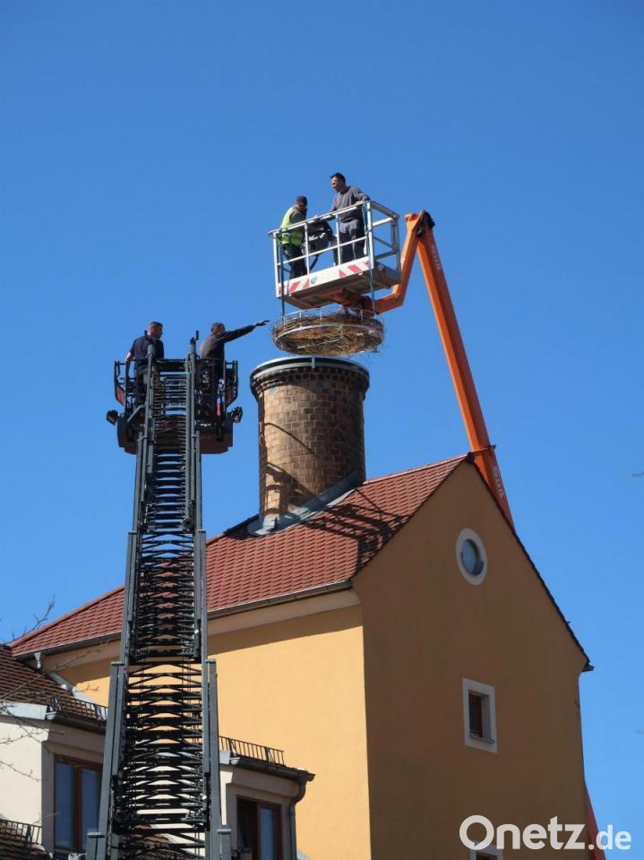 Vor zwei Wochen wurde Meister Adebar nun wieder auf dem Malzhaus, in dem sich früher die Rino-Werke befanden, gesichtet. Rasch beauftragte die Stadt Vilseck den Metallbauermeister Thomas Pröls von der Firma Amann mit der Anfertigung einer geeigneten Nestkonstruktion mit Unterbau. Dank des Entgegenkommens der Hausbesitzer Markus und Sabine Kederer konnte nun das Storchennest mittels eines Krans und der Drehleiter mit Hebebühne der US-Südlager-Feuerwehr auf den Turm gehievt werden. Mitarbeiter des Bauhofs hatten das neue Nest, das einen Durchmesser von 1,80 Meter aufweist, zuvor mit Weidenruten, Birkenreisig und Schilf von den Vilsauen ausgekleidet.