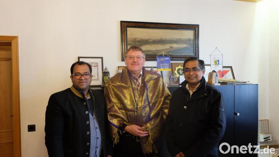 Pater Robin nutzte die Gelegenheit seinen Provinzial beim Bürgermeister Hans-Martin Schertl im Rathaus vorzustellen. Der Provinzial hatte am Wochenende die Gottesdienste in der Pfarreiengemeinschaft Vilseck, Schlicht und Sorghof mitgestaltet und konnte sich davon überzeugen, dass Pater Robin bestens aufgenommen ist. Im Gespräch wurde auch diskutiert, dass vor 100 Jahren deutsche Missionare den katholischen Glauben nach Indien brachten. Jetzt bringen die indischen Priester die „Früchte des Glaubens“ zurück nach Europa. Der Bürgermeister äußerte die Bitte, dass Pater Robin noch viele Jahre in der Stadt Vilseck bleiben soll, damit die herzliche Verbindung zu ihm weiter aufrecht erhalten werden kann. Leider konnte der Provinzial hier keine Zusage geben oder ein Datum nennen, wie lange indische Patres grundsätzlich in einer Pfarrei verbleiben können. Als Zeichen der Verbundenheit überreichte der Provinzial an Bürgermeister Hans-Martin Schertl einen traditionellen Seidenumhang, der in Indien an Festtagen getragen wird.
