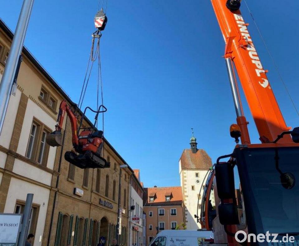 Um nicht den Durchgangsbereich und das gesamte Foyer im Rathaus aufgraben zu müssen, hat man sich entschlossen, die Leitung vom Marktplatz bis zum Innenhof mittels einer Erdrakete „durchzuschießen“ und dann weiter zu verlegen. Für die Baugrube im Innenhof musste ein Minibagger über das vordere Rathausgebäude gehoben werden, deshalb war ein großer Autokran der Firma Einhäupl eingesetzt.
