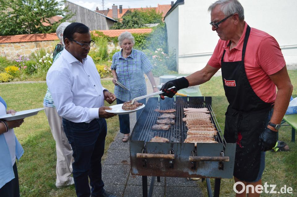(rha) Und abschließend schmeckte auch noch das Eis. Dazwischen aber gab es, was zu einem richtigen Grillfest gehört: Bratwürste, Steaks und Bauchfleisch. Mesner und Grillmeister Ernst Andraschko ließ sich vom Seniorenteam nicht lange bitten, heizte den Grill rechtzeitig an und verwöhnte alle mit seinen Grillspezialitäten. Dazu gab es leckere Salate. Zusammen mit Pfarrvikar Hruday Madanu und Diakon Dieter Gerstacker genossen die älteren Herrschaften unter Sonnenschirmen das gemütliche Beisammensein.