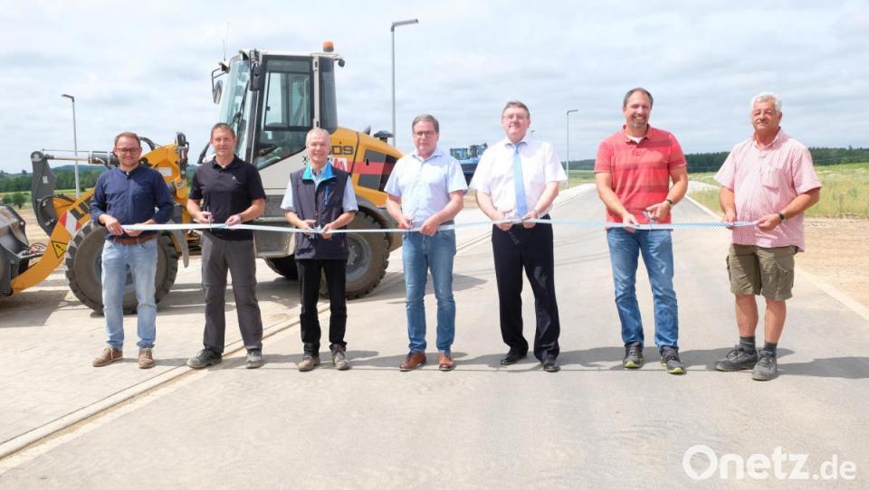 Beim Durchschneiden des Bandes (von links); Georg Rumpler vom Ingenieurbüro Renner, Andreas Völkl von der Firma Markgraf, Freddy Leberkern von der Firma KFB, Erwin Schall vom Ingenieurbüro Renner, Bürgermeister Hans-Martin Schertl, der städtische Bauamtsleiter Stefan Ertl und Reiner Neumann von der Firma Markgraf.