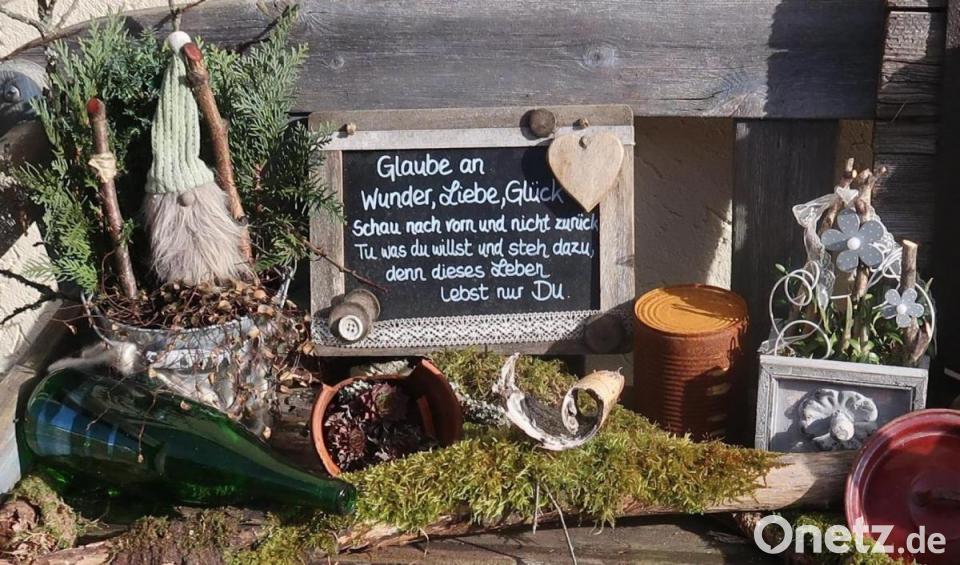 "Nur nicht aufgeben", scheint dieser sinnvolle Text zu sagen. Zuversichtlich in die Zukunft zu blicken, ist gemäß diesen Wochen mehr als je zuvor angesagt. Auf einer hübsch dekorierten alten Gartenbank in der Vilsecker Bahnhofstraße steht dies weiß auf schwarz zu lesen und ermutigt zum Durchhalten.
