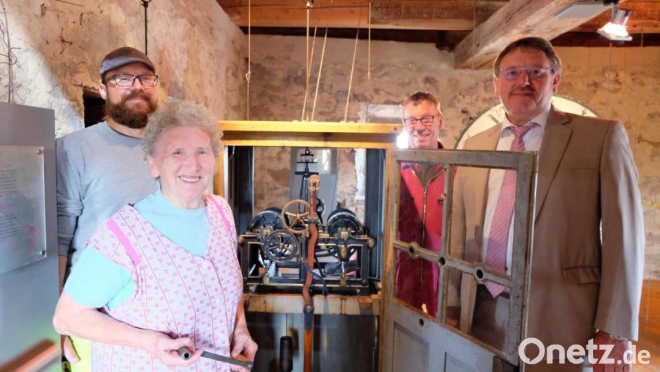 Reinhold Rittmeier von der Firma Hölz repariert seit 20 Jahren historische Uhrwerke und überholte nun auch das Exemplar im Vogelturm professionell. Bei dieser Gelegenheit wies er auch gleich den für die städtischen Liegenschaften verantwortlichen Mitarbeiter Michael Nutz in die Funktionsweise des Uhrwerks ein, so dass er kleinere Wartungsarbeiten künftig selbst erledigen kann.