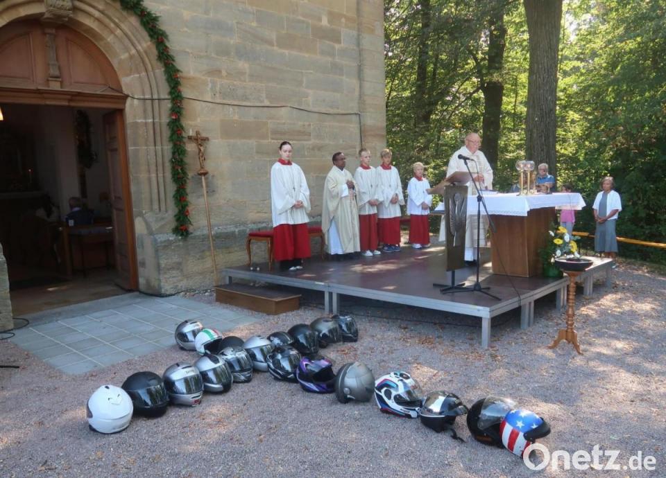 Tradition hat auch der Bikergottesdienst, zu dem am ersten Bergfestsonntag wieder viele Motorradfahrer mit ihren Maschinen zum Freialtar gekommen waren. Pfarrer Andreas Giehrl aus Kallmünz, der früher selbst Motorrad fuhr, griff in seiner Predigt das Evangelium vom Taubstummen auf, den Jesus geheilt hatte. Er sagte, dass auch die Menschen heute in gewisser Weise taubstumm geworden seien. An die Gottesdienstbesucher teilte er weiße Blätter auf, auf denen nur ein schwarzer Punkt zu sehen war. Jeder nehme nur den schwarzen Punkt wahr, nicht aber das große weiße Umfeld. „Sehen wir nicht meist nur die dunklen Flecken in unserem Leben und übersehen das Helle und Schöne?“, fragte er und forderte die Gläubigen auf, den Blick doch wieder nach oben zu richten und miteinander zu reden. Dunkelheiten und Negatives könne man getrost den Herrgott überlassen, "denn er wird alles zum Guten wenden".
