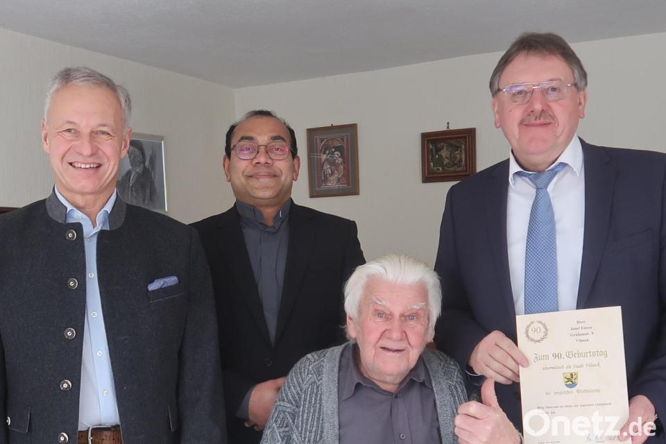 Eierers Verdienste hatten Bürgermeister und Stadträte vor kurzem durch eine besondere Auszeichnung gewürdigt. „Auf die Bürgermedaille in Silber bin ich sehr stolz“, sagte der Jubilar und zeigte sie seinen Gästen bei der Geburtstagsfeier, zu der sich die Vertreter von sechs Vereinen und viele Freunde und Bekannte die Klinke in die Hand geben. Auch die Bürgermeister Hans-Martin Schertl und Thorsten Grädler sowie Pater Jimmy Joseph als Vertreter der Pfarreiengemeinschaft überbrachten Glückwünsche und Geschenke.