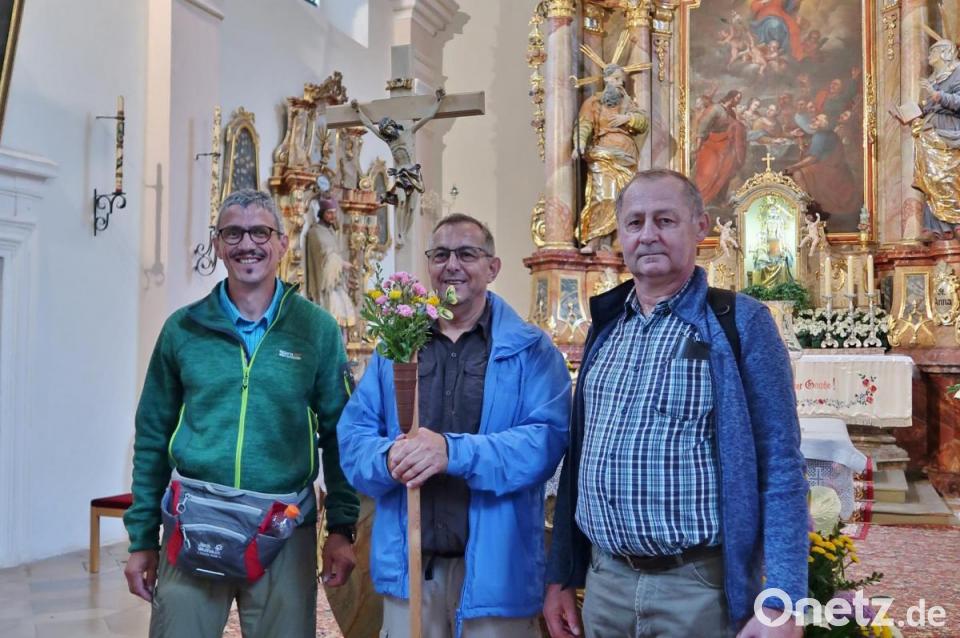 Die Pfarreiengemeinschaft Vilseck-Schlicht-Sorghof unternahm diese kleine Wallfahrt zum elften Male. Unter Leitung von Hans Weiß und mit Unterstützung durch Edmund Heldmann gelangte die Pilgerschar über das Birker, Unterschalkenbach, Kreuzberg und Irlbach zur Brotzeitstation in Süß. Nach kurzer Einkehr im Gasthaus zum Löwen ging es betend und singend weiter nach Hahnbach. Am Fuße des Frohnbergs begann der anstrengende Aufstieg zum Gnadenort. Nach den 143 kraftraubenden Stufen erreichten die Vilsecker die Wallfahrtskirche und dankten Maria, der Himmelskönigin, mit dem schönen Vilsecker Marienlied „Kennt ihr das Bild dort am Altar“. Hahnbachs Pfarrer Christian Schulz begrüßte die Wallfahrer zur Messe am Freialtar. Nach seelischer Stärkung kam auch das leibliche Wohl nicht zu kurz. Die Hahnbacher Bergfestschmankerln waren wie immer sehr begehrt.