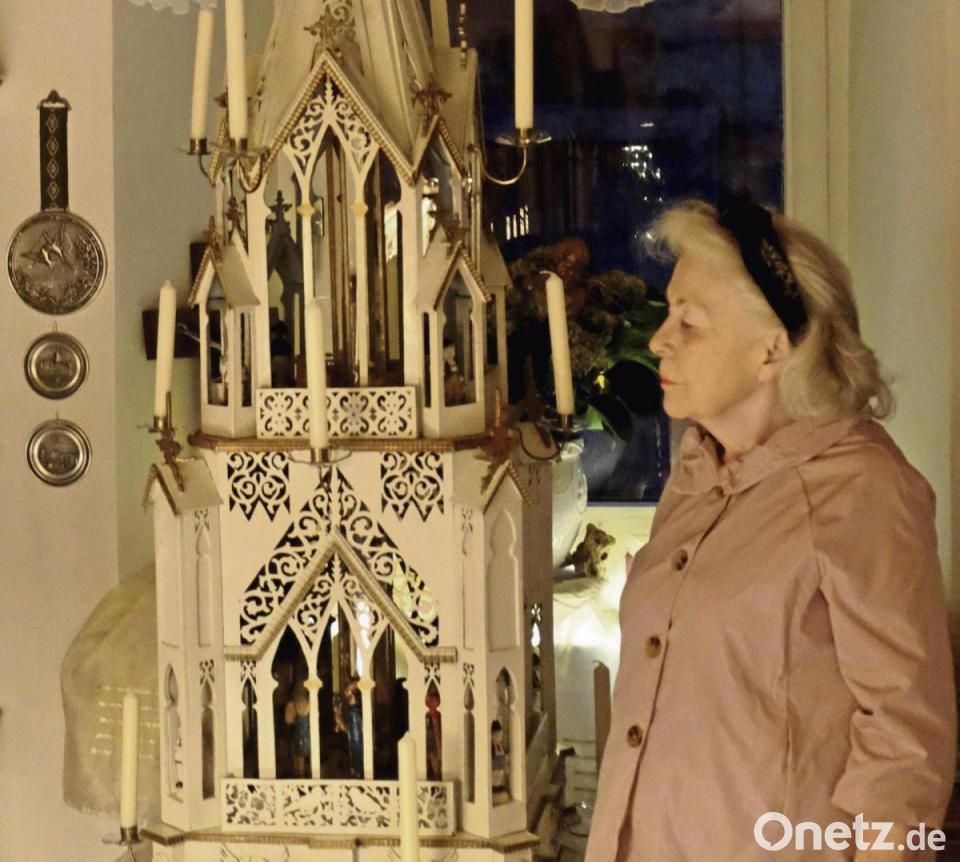 „Beim Aufbau der Pyramide überkamen mich wehmütige Gefühle. Es war wie Heimweh“, erzählt Maria Deinzer. Die gebürtige Sächsin lebt seit 26 Jahren in Vilseck und denkt besonders in der Weihnachtszeit zurück an die Tradition in ihrer früheren Heimat. So hat sie heuer nach fünf Jahren wieder einmal ihr besonderes Kleinod aufgebaut. Es ist ein Erbstück ihres Urgroßvaters Hermann Wolf, der in Kirchberg, Kreis Zwickau, von 1864 bis 1948 lebte. Der Tuchmacher und Webmeister hatte ein besonderes Geschick für handwerkliche Arbeiten.