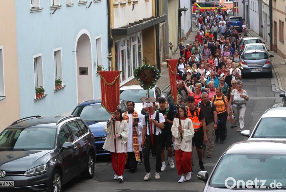 Nachdem an den vergangenen zwei Pfingstfesten nur einzelne private Grüppchen das Pestgelübde erfüllt hatten, wallfahrteten heuer wieder 60 Pilger gemeinsam zum Gnadenort nach Gößweinstein. Pater Robin Xavier sandte die Pilger mit seinem Segen auf den 27 Kilometer langen Weg. Vorausgehend wechselten sich Luis Ziegler, Jakob Schießlbauer und Simon Liermann beim Tragen des Wallfahrtsbildes ab. Wegen einer Straßensperrung war ein Zeitrückstand aufzuholen. Und so ging es eiligen Schrittes, jedoch andächtig betend und singend von Michelfeld über Horlach zur Mittagsrast. In Kirchenbirkig wurde die Gruppe im Pfarrheim bewirtet. Neu war, dass man bereits auf dem Hinweg durch das Klumpertal dem Urlaubsverkehr abseits der Hauptstraße auswich.