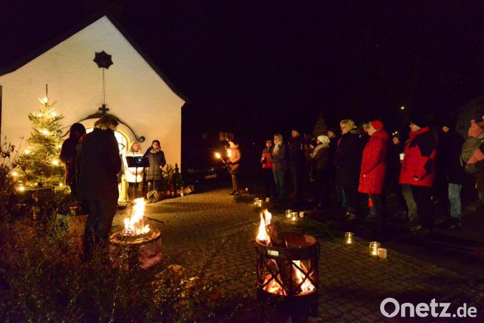 Doch die Vöslesriether stört weder Kälte noch Wind: Sie feiern wie alljährlich mit Musik und Textbeiträgen ihre Dorfweihnacht. Reinhold Brey heißt die Gäste willkommen, „ChorAhnung“ singt unter Begleitung von Alexander Völkl zur Eröffnung der Feier von „White Christmas“. Manuela Brey trägt das Gedicht „Zuwendung“ vor.