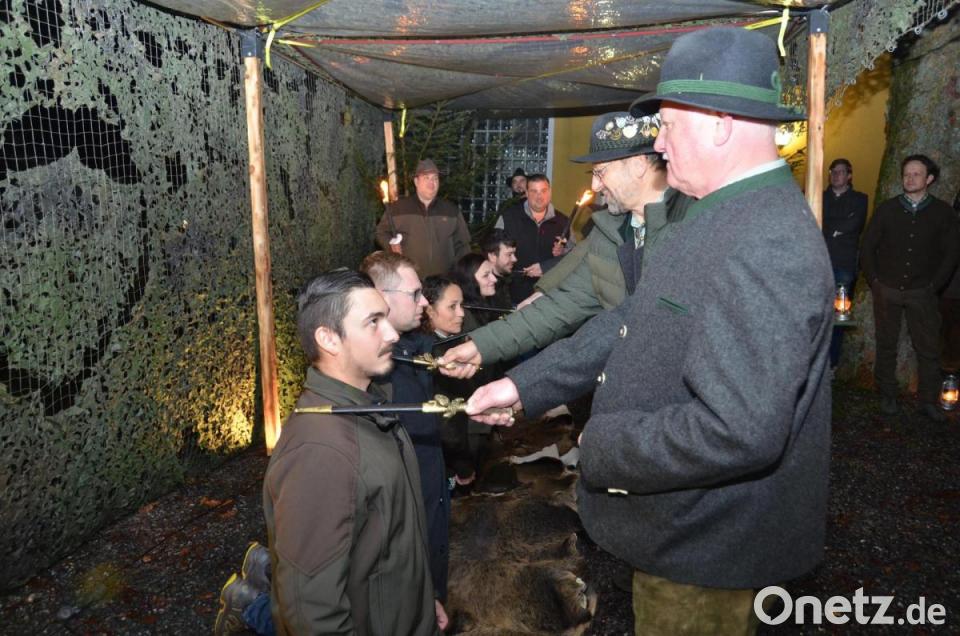 „Persönlich ist mir der Hubertustag der liebste im ganzen Jagdjahr. Um über unser Tun im Revier nachzudenken und sich darüber zu freuen, dass wir das Privileg zur Jagd haben“, versicherte Ertl, als passionierter Waidmann. Der Höhepunkt des Abends war der Jägerschlag, eine würdevolle Zeremonie, die bis heute in Waidmannskreisen Bestand hat. Dabei wird den Jungjägern feierlich mit einem Hirschfänger dreimal sachte auf die Schulter geschlagen. Dazu wird folgender feierlicher Spruch aufgesagt: „Der erste Schlag soll dich zum Jäger weihen. Der zweite Schlag soll dir die Kraft verleihen, zu üben stets das Rechte. Der dritte Schlag soll dich verpflichten, nie auf die Jägerehre zu verzichten.“ Insgesamt 13 Jungjäger wurden so in der Kreisgruppe aufgenommen und erhielten ihren Jägerbrief. Traditions- und Hornmeister Eduard Forster reichte schließlich den Jungjägern auch noch ein Glas Wildschweiß, das die Teilnehmer in einem Schluck leeren sollten.