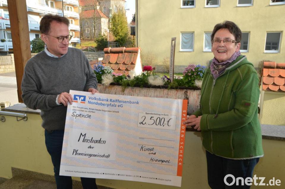 Mit einer riesigen „Ostereierüberraschung“ tauchte Christa Wildenauer aus Straßenhäuser bei Dekan Alexander Hösl kurz vor Ostern auf. Sie überbrachte für die Ministranten der Pfarreiengemeinschaft einen Spendenscheck in Höhe von 2500 Euro. Geld, das sie in den vergangenen Wochen wieder mit ihrem Flohmarkt „Kunst und Krempel“ erwirtschaftete.