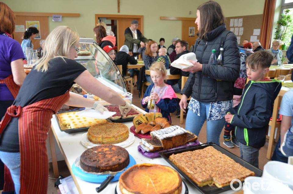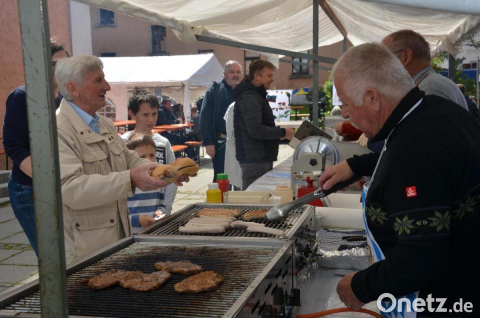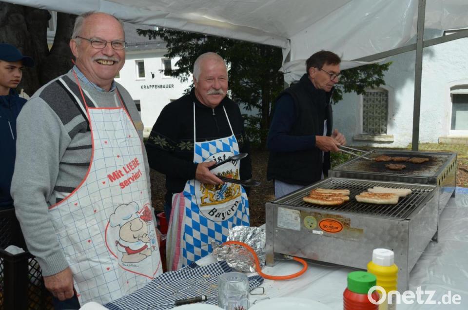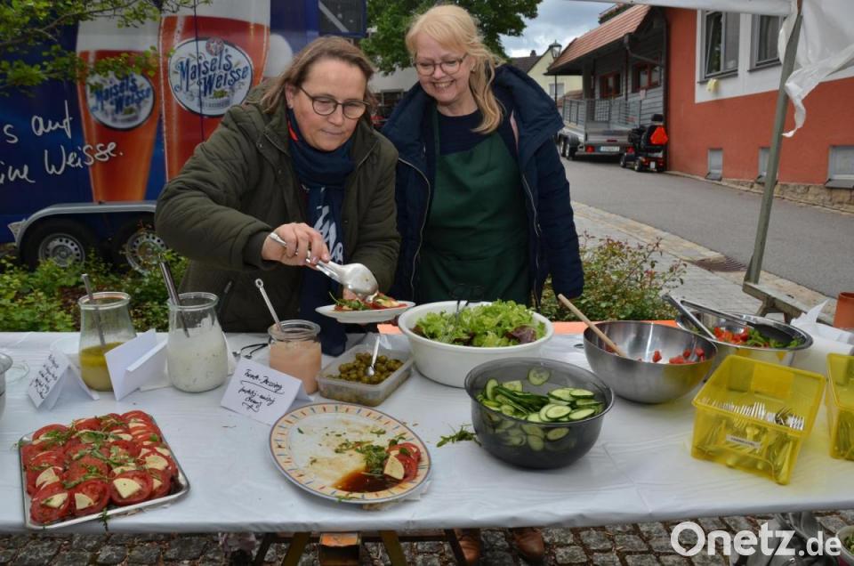 Auch wenn das Wetter gar nicht festlich daherkam, nahmen Besucher die Angebote gerne an. Vor allem der Mittagstisch mit 130 Portionen von 16 verschiedenen Eintöpfen war gefragt. Einige Besucher kamen auch mit Geschirr und nahmen die Köstlichkeiten mit nach Hause. Wem es draußen zu kalt war, setzte sich an die langen Tafeln im Gemeindehaus. Gerne angenommen wurde auch die sehr gute Auswahl an der Salatbar und die 56 selbstgebackenen Kuchen und Torten. „Erstmals haben wir glutenfreie Kuchen“, schwärmte Andrea Weich. 300 Paar Bratwürste und 150 Scheiben Grillfleisch brutzelten auf dem Grillrost. Kirchenpfleger Hermann Bibel arbeitete den Grillchefs zu und Vertrauensfrau Ulrike Kießling übernahm die Kassengeschäfte. Lydia Großmann schnitt elf Kilogramm Käse.