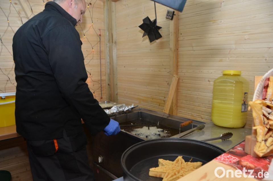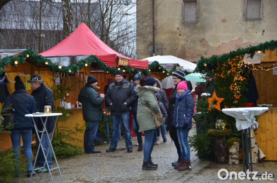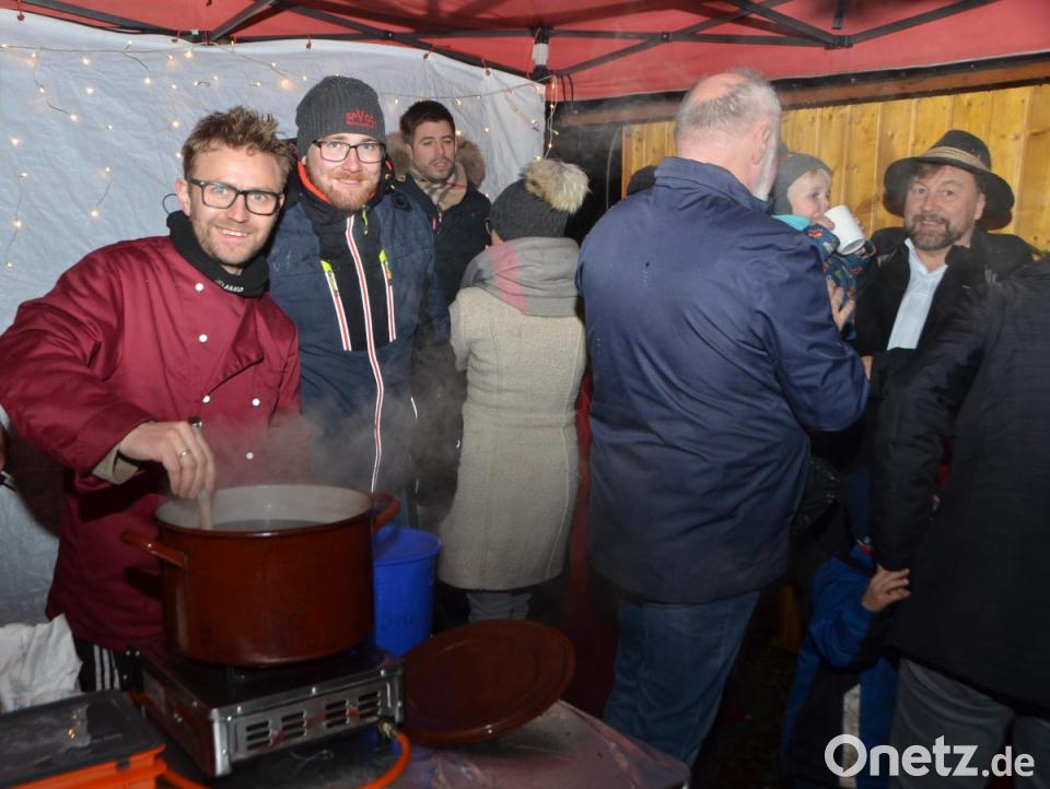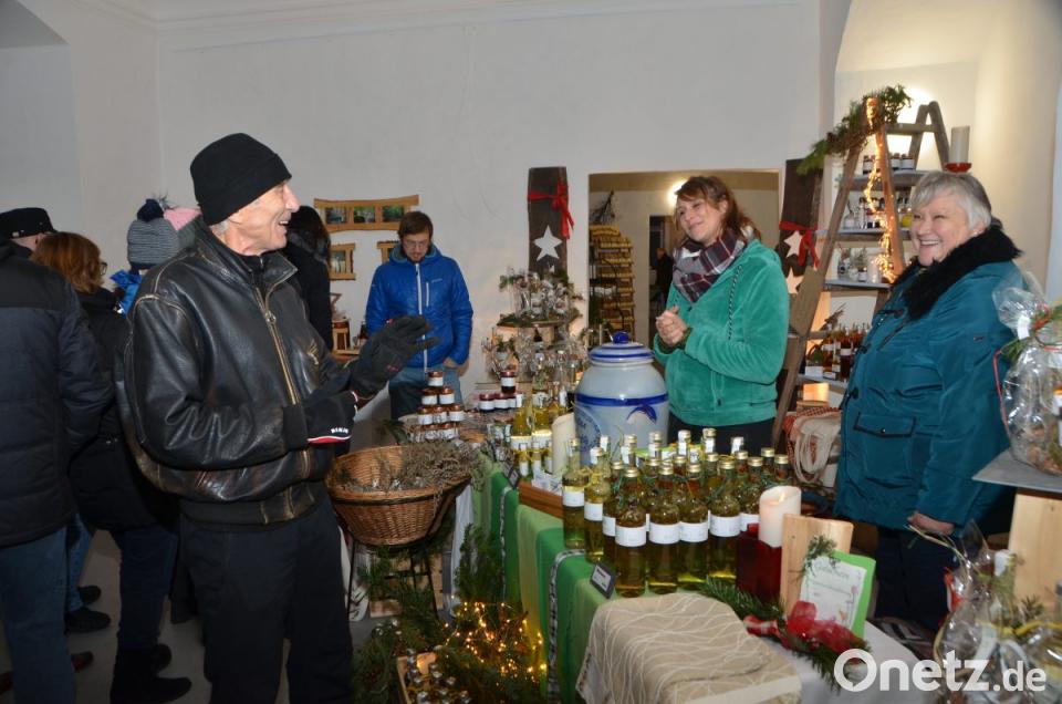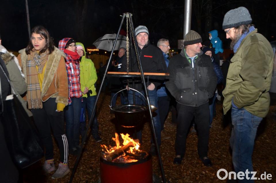 Hans Schnupfhagn aus Burgtreswitz ist zum zweiten Mal im Schlosshof dabei und bäckt mithilfe alter Eisenmodeln Sternküchel aus dem schwimmenden Fett aus. Es war eine Idee zur Unterstützung des Studiums seiner Töchter, erklärte der Burgtreswitzer, während er die Form in den vorbereiteten Teig taucht und in die heiße Fettpfanne hebt und gold-gelb ausbäckt. Gleich gegenüber rührt Maximilian Gebert in der Feuerzangenbowle und im Stand nebenan werden für die Spielvereinigung Crêpes gebacken. Um die Feuerstelle des St.-Thomas-Schützenvereins aus Oberlind scharen sich die Besucher. Die ausgelegten Hackschnitzel sorgten für einen sauberen und weichen Untergrund im Freien.