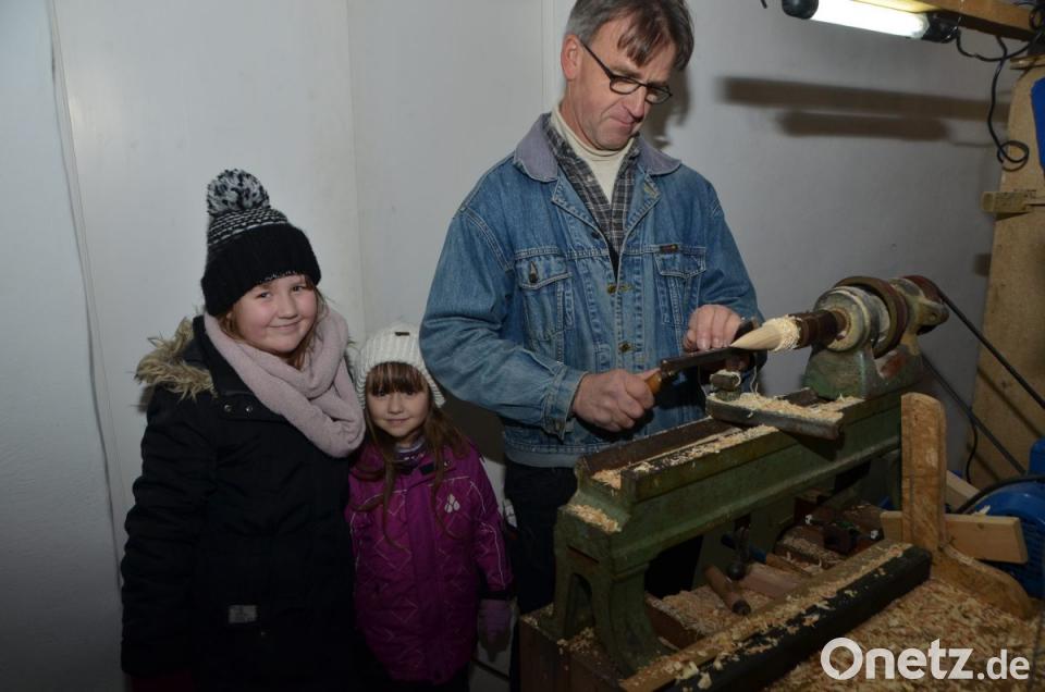 Die Enkelkinder schauen ihrem Opa Richard Reger an seiner Drechselbank zu.