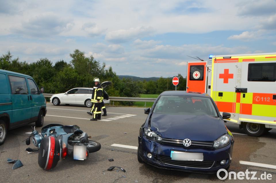 (dob) Ein schwerer Unfall mit einem lebensgefährlich verletzten Motorrollerfahrer passierte am Freitagnachmittag auf der Kreisstraße 37 bei Vohenstrauß auf Höhe der Abzweigung nach Böhmischbruck, die zugleich die Auf- und Abfahrt zur A 6 darstellt. Ein 20-jähriger Mann war gerade dabei, die Autobahn zu verlassen und wollte die Kreisstraße in Richtung Böhmischbruck überqueren. Dabei übersah er offenbar einen herannahenden Honda-Motorroller, der Richtung Moosbach unterwegs war und erfasste ihn mit seinem VW-Golf frontal. Dabei zog sich der 71-jährige Rollerfahrer lebensgefährliche Kopfverletzungen zu. Der Golf-Fahrer und seine 17-jährige Beifahrerin wurden leicht verletzt. Notarzt und BRK-Rettungsteam kümmerten sich um den Schwerstverletzten, der anschließend vom Rettungshubschrauber „Christoph 80“ ins Klinikum St. Marien nach Amberg geflogen wurde. Die Vohenstraußer Feuerwehrleute sperrten die Unfallstelle ab und leiteten den Verkehr um. Kreisbrandmeister Christian Demleitner aus Tännesberg war ebenfalls an der Unfallstelle, genauso wie BRK-Einsatzleiter Marco Rappl. Die Kollegen der Vohenstraußer Polizeibeamten von der VPI Weiden unterstützten bei der Unfallaufnahme. Den Gesamtschaden bezifferten die Polizisten auf rund 8000 Euro.
