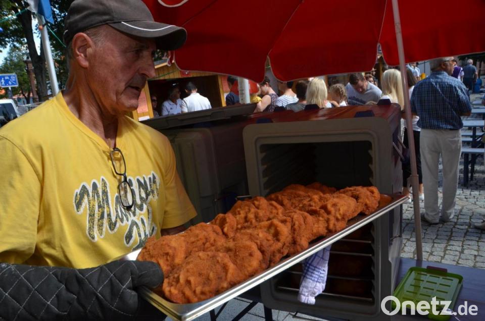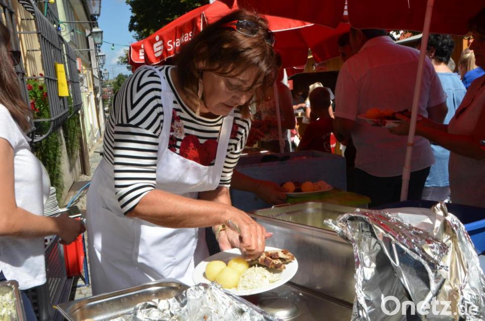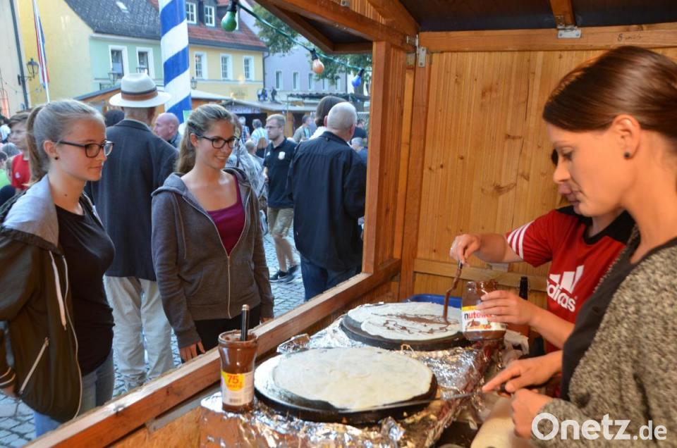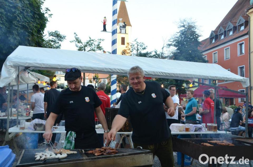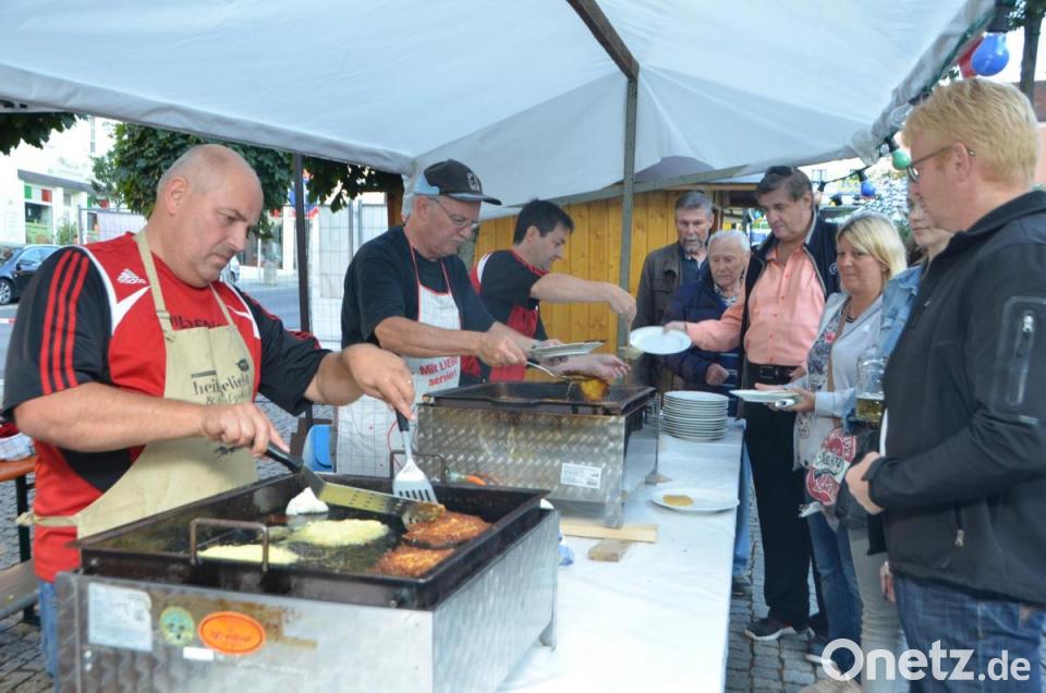 Dank der 130 Helfer aus den Kinder- und Jugendabteilungen, über die Herrenmanschaften bis in den Seniorenbereich und den „Rot-Weiß“-Keglern brutzelten die SpVgg-Mitstreiter Steaks, Bratwürste oder Burger im Akkord oder lieferten mit Hilfe der Familie Kick eine delikate Forelle vom Rost. Jeder konnte nach Herzenslust und eigener Vorliebe schmausen. Zur Mittagszeit am Sonntag wurden die Schnitzel und Braten wie in einer gutbürgerlichen oberpfälzer Küche im Sekundentakt an die Festgäste ausgegeben. Der SpVgg-Vorsitzende Uli Münchmeier höchstpersönlich reihte sich als Gastgeber in die Helferschar ein und spießte die Schnitzel aus der Pfanne auf die Teller. Rund 220 Portionen wanderten über den Tresen. Die „Weidener Holzblech“ spielten dazu zünftig vor dem Rathaus auf. Im kühlen Rathausgang bauten währenddessen die Hobbybäckerinnen ihre kulinarische Vielfalt aus der heimischen Küche auf. So mancher Konditor wäre angesichts der großen Auswahl wohl vor positivem Neid erblasst. Verpönt ist beim Altstadtfest aller Schnickschnack. Die Besucher lieben die bodenständigen Angebote und die Bevölkerung dankt den Kickern mit zahlreichem Besuch.