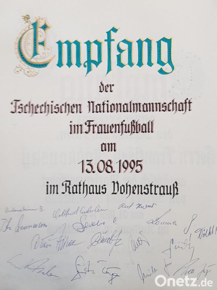 Der Vorsitzende des tschechischen Frauenfußballverbands, Otto Beichel, bedankte sich für die freundliche Aufnahme und stellte die Funktionäre und Spielerinnen vor. Zehn Nationalspielerinnen stammten von den Spitzenvereinen Slavia Prag und Sparta Prag. Mit Stolz wies Beichel darauf hin, dass alle Frauen nur in tschechischen Vereinen spielten. Im Anschluss an den Empfang trugen sich die Spielerinnen und Gäste in das Goldene Buch der Stadt ein. An Günther Lommer und an die Spielführerinnen der tschechischen Nationalmannschaft Martina Jedličková, der Fußballspielerin des Jahres 1994 in Tschechien, überreichte Bürgermeister Hermann zur Erinnerung einen Zinnteller mit dem Stadtwappen. Die Gäste revanchierten sich mit Krawatten, Wimpeln und Anstecknadeln.