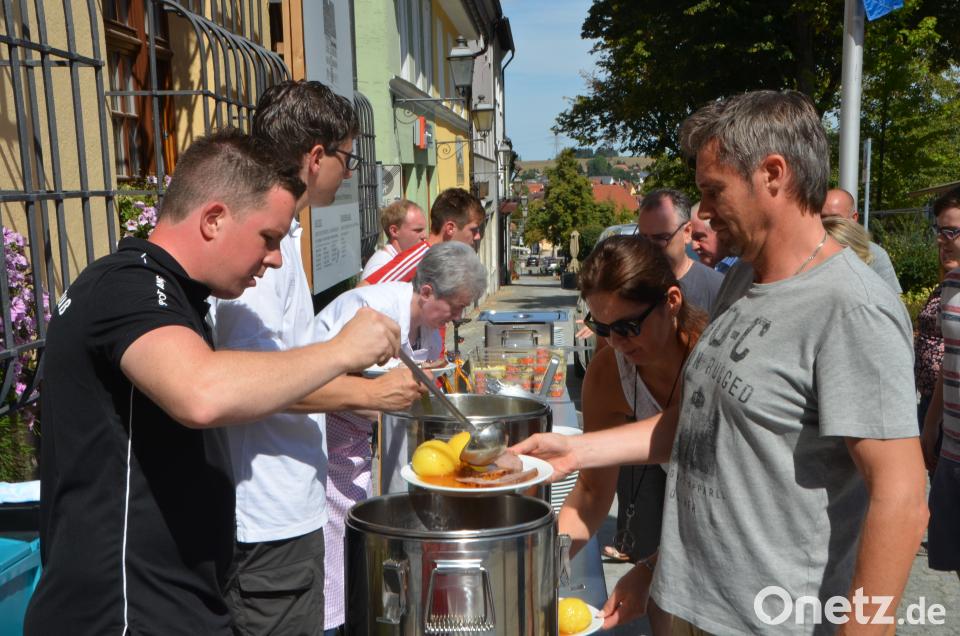 Schweinebraten mit Knödel finden immer besten Anklang. Da greift selbst der SpVgg-Vorsitzende Uli Münchmeier (Zweiter von links) zum Schöpflöffel.