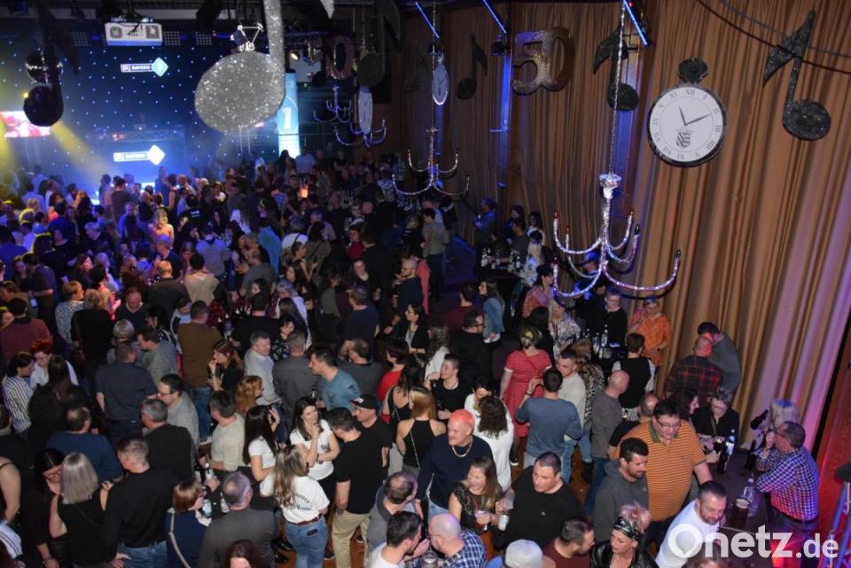 Im Saal war Moderator und DJ Jürgen „Kauli“ Kaul in seinem Element und zündete pünktlich um 21 Uhr ein musikalisches Feuerwerk. Er sorgte mit Musik aus den 70er, 80er und 90er Jahren und natürlich mit Hits aus den Nullerjahren bis heute für beste Stimmung . Die Tanzfläche vor der Bühne war den ganzen Abend über sehr gut besucht. Disco-Fox, Chacha, Blues oder Abtanzen zum Disco-Sound – alles war möglich. Viele Songs verleiteten die Gäste auch zum lautstarken Mitsingen. So konnte man auch noch vor den Türen der Stadthalle Gloria Gaynors „I Will Survive“ oder die „99 Luftballons“ von Nena hören. Textsicher waren die Discobesucher auch bei „Hallo, Klaus“ und dem „Skandal im Sperrbezirk“ genauso wie bei „Major Tom“ und „Westerland“.