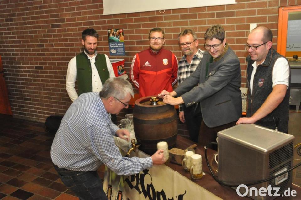 SpVgg-Vorsitzender Uli Münchmeier freute sich, dass die Premieren-Veranstaltung dermaßen gut angelaufen war, dass man sich heuer entschied erneut Gäste dazu als eine Art Nachkirchweih ins Sportzentrum einzuladen. Der Moosbacher Braumeister Uli Scheuerer von der gleichnamigen Landbrauerei kam nach Vohenstrauß, um den Bieranstich vom Holzfass zu überwachen. Stellvertretender Vorsitzender Rainer Gebert ließ es sich nicht nehmen, den Zapfhahn nach Wiesn-Tradition per Holzschlegel in das Fass zu treiben. „Viele meinen immer, der Bockbieranstich gehört in die Fastenzeit, doch in den Herbst passt dieses süffige Getränk ausgezeichnet“, erklärt der Brauer. Zur Unterhaltung spielte das Geschwister-Duo Baier aus Wittschau auf. Natürlich sorgten die SpVgg-Helfer auch für eine ausgezeichnete kulinarische Unterlage zur Bierspezialität.
