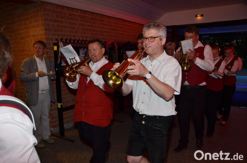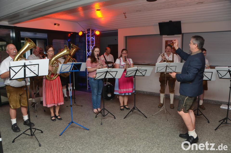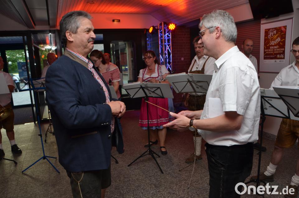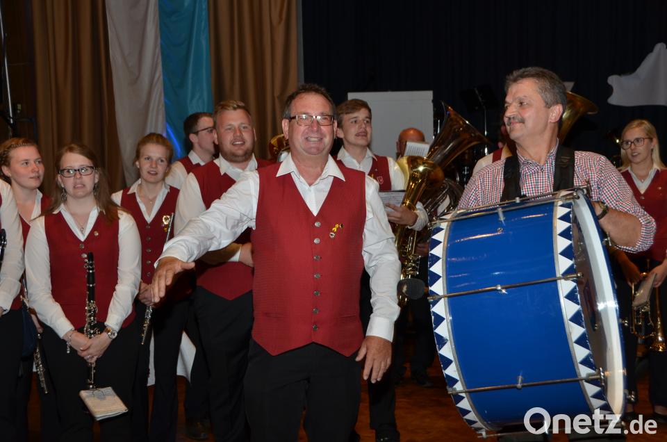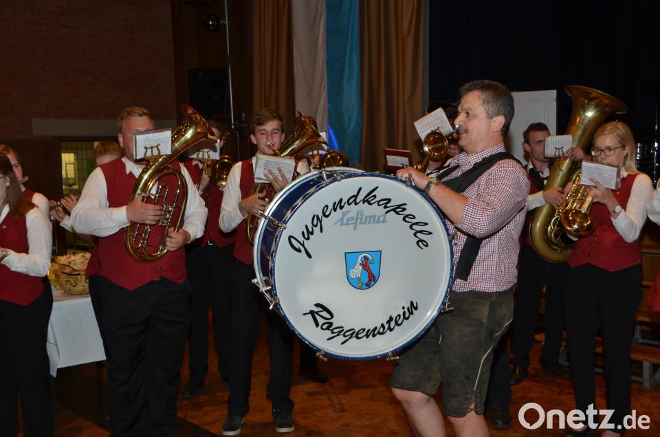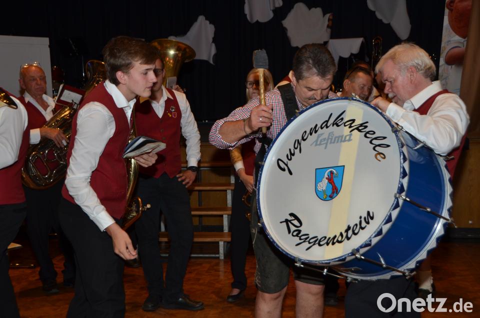 Selbst die große Trommel schlug der Jubilar und gab den Takt für die Jugendkapelle Roggenstein vor.