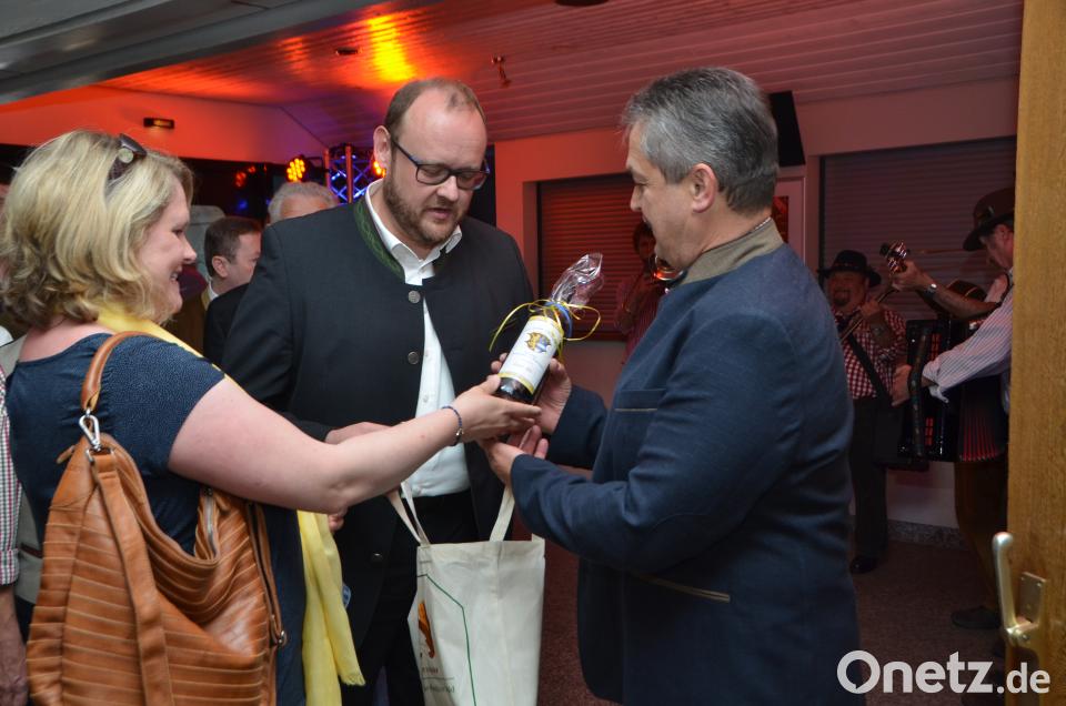 Landrat Andreas Meier mit Ehefrau Jutta gratulierte Andreas Wutzlhofer (rechts) mit einem Landkreiswein.