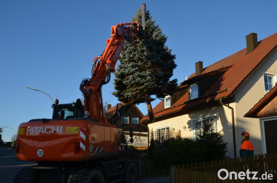 Gut eine Woche vor dem ersten Advent laufen die Vorbereitungen auf Hochtouren. Der Weihnachtsbaum, der heuer auf dem Marktplatz erstmals am Adventsmarkt Festtagsglanz verbreitet, stammt aus dem Garten von Barbara und Gabriel Klapper, die diese Blautanne vor 29 Jahren bei ihrem Einzug pflanzten. Jetzt ist der Baum vor den Fenstern einfach zu groß geworden und wurde nun als Spende der Stadt vermacht. Martin und Erwin Reil sägten den acht Meter hohen Baum ab, den Baggerführer Franz Kaas über den Zaun hievte und zum Marktplatz transportierte. Derzeit sind die Bauhofmitarbeiter auch mit der Weihnachtsbeleuchtung am Marktplatz beschäftigt. Die rund 700 Meter lange, tannengeschmückte Lichterkette wurde schon vor Jahren mit LED-Lichtern ausgerüstet, die je Beleuchtungsmittel etwa 1,2 Watt pro Stunde an Strom verbrauchen.
