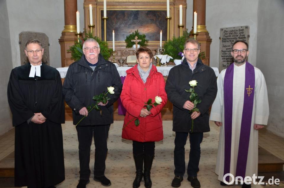 Stadtpfarrer Dieter Schinke verabschiedete drei Mitglieder aus dem Kirchenvorstand. Er holte Rudolf Großmann, der 18 Jahre ununterbrochen die Kirchenvorstandsarbeit leistete, Jürgen Hilburger (12) und Lore Marko (6) nach vorne in den Altarraum, um sie beim Gottesdienst zu würdigen. Den Ausscheidenden schenkte der Pfarrer für die langjährige Unterstützung in der Kirchengemeinde Rose und Urkunde. In der Predigt ging er auf die Kerze ein, die Symbol der Wärme und des Lichts ist. Menschen brauchen für das Herz Licht und für Niederlagen Wärme und menschliches Miteinander. „Die Frage, ob ich Gott finde, hat damit zu tun, ob ich bereit bin, in seinem Wort zu leben.“ An die Scheidenden sagte Pfarrer Schinke ein herzliches „Vergelt’s Gott“ und dankte für den Einsatz der Vertrauensleute Ulrike Kießling und Uli Münchmeier.