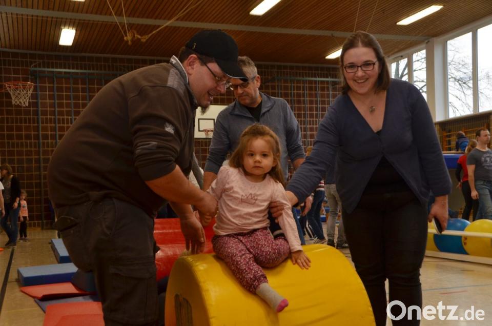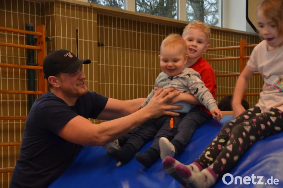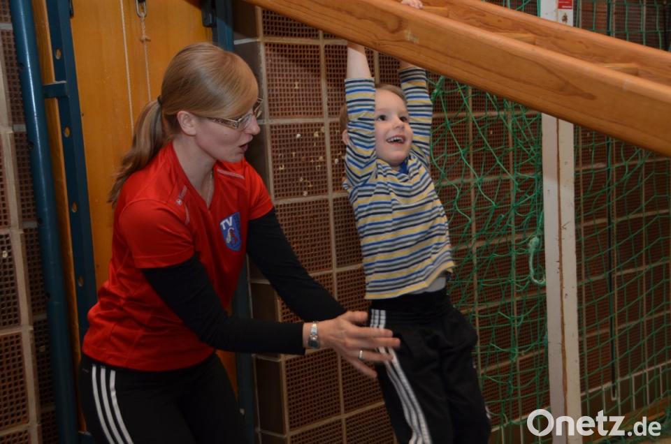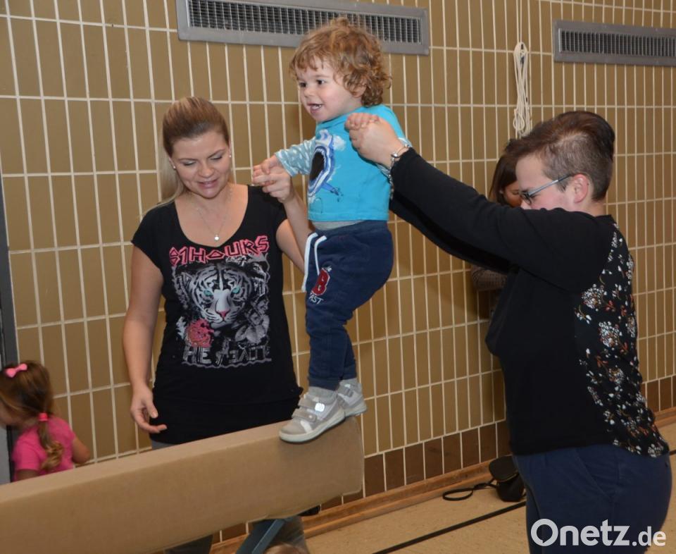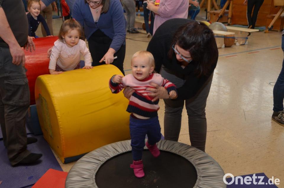 Den Begleitern blieb bei den ersten Runden jedenfalls keine Verschnaufpause. Einfach nur einmal den Spiel- und Entdeckungsdrang freien Lauf lassen können, ist für die Kids das Allerschönste und wurde am Freitagnachmittag in der Eglseeturnhalle beispielhaft praktiziert. Mitgebracht brauchte nur gute Laune und Spaß werden, alles andere war vorprogrammiert. Besonders anstrengend war die längere Bewegungsstraße mit Kasten, Bock und Trampolin. Die kleinsten Gästen konnten es auf den bunten und enganeinandergereihten Sitzbällen zwischen zwei Langbänken gemütlicher angehen und über die „kleinen Berge“ krabbeln. Eine sogenannte „Feuerwehrrutsche“ kam natürlich bei den Jungs mächtig an. Während sie auf der glatten Fläche nach oben stiegen, hantelten sie sich nach dem Durchschlüpfen auf dem „Gipfel“ mit den Händen freischwingend nach unten auf sicheren Boden. Übungsleiterinnen des Turnvereins standen unterstützend zur Seite, damit wieder alle gesund und munter unten ankamen. An den freischwebenden Tauen fühlten sich die Kinder wie im Urwald an Lianen. Ein ums andere Mal verlangten sie von ihren Eltern angeschubst zu werden und juchzten vor Freude.
