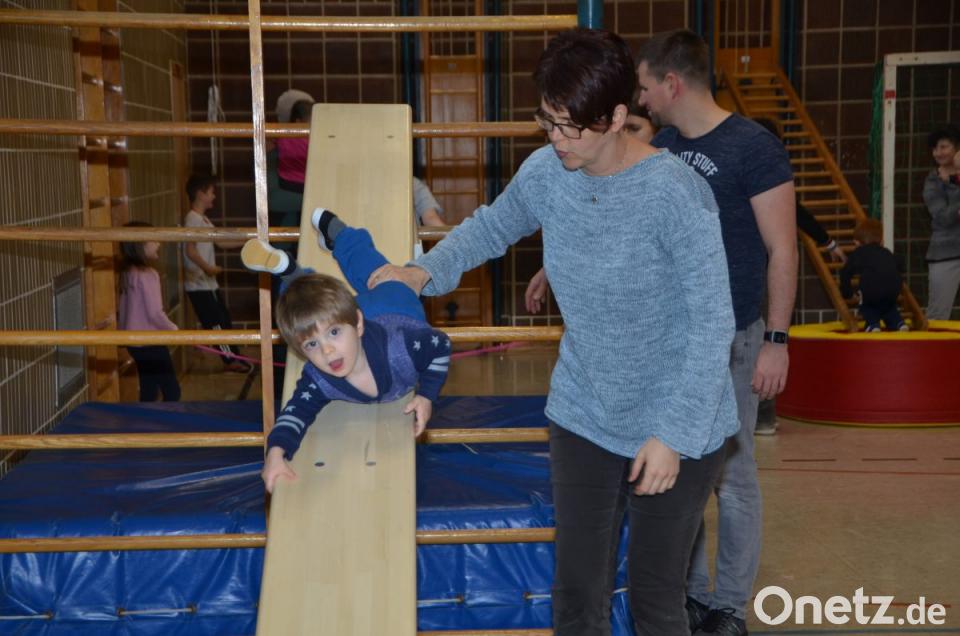 So mancher Papa oder Mama kam gehörig ins Schwitzen. Die Kinder legten ein stattliches Tempo vor. Hinauf auf die Matte und rückwärts wieder hinunter oder mit vollem Schwung an die Reckstangen und wie die Feuerwehrleute in den Gerätehäusern hinuntersausen auf die großen ausgelegten Bodenmatten.