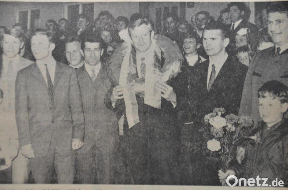 Spielführer Rudolf Scholz erhielt den goldenen Lorbeerkranz am Rotkreuzhaus beim Empfang der Fußballer nach ihrem letzten Spiel in Saal. Ein fulminanter Einzug ins Rathaus folgte.