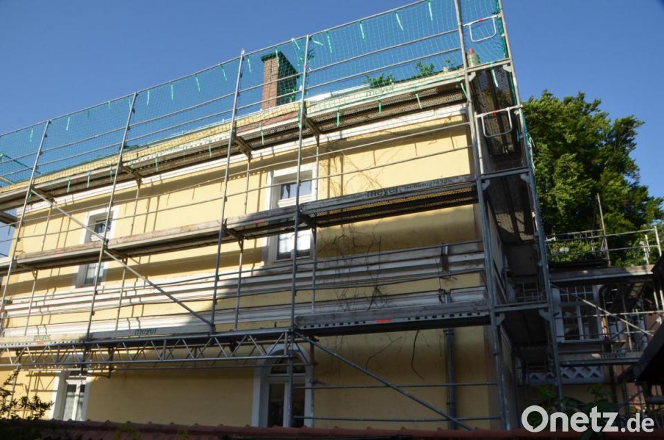 Bis Mitte August soll auch die Außenrenovierung abgeschlossen werden. Das gesamte schadhafte und rund 272 Quadratmeter große asbesthaltige Kunstschieferdach wurde abgetragen und wird durch ein neues ersetzt, auch im Wintergartenbereich. Laut Zimmermeister Michael Karl werde die „Altdeutsche Deckung“ vorgenommen, deren Hauptmerkmal die Verwendung von frei Hand zugerichteten Decksteinen ist. Zudem wurden die Dachrinnen erneuert und die Gauben neu eingedeckt. Die Wasserschäden hinter den Gesimsen an den Außenwänden will man nun mit der Einarbeitung von Dehnungsfugen Einhalt gebieten, informierte Münchmeier. Nach der Mauersanierung kommen darauf ebenfalls neue Zinkbleche. Im Zuge der Renovierung bekommt schließlich auch die große Eingangstüre eine farbliche Auffrischung verpasst.