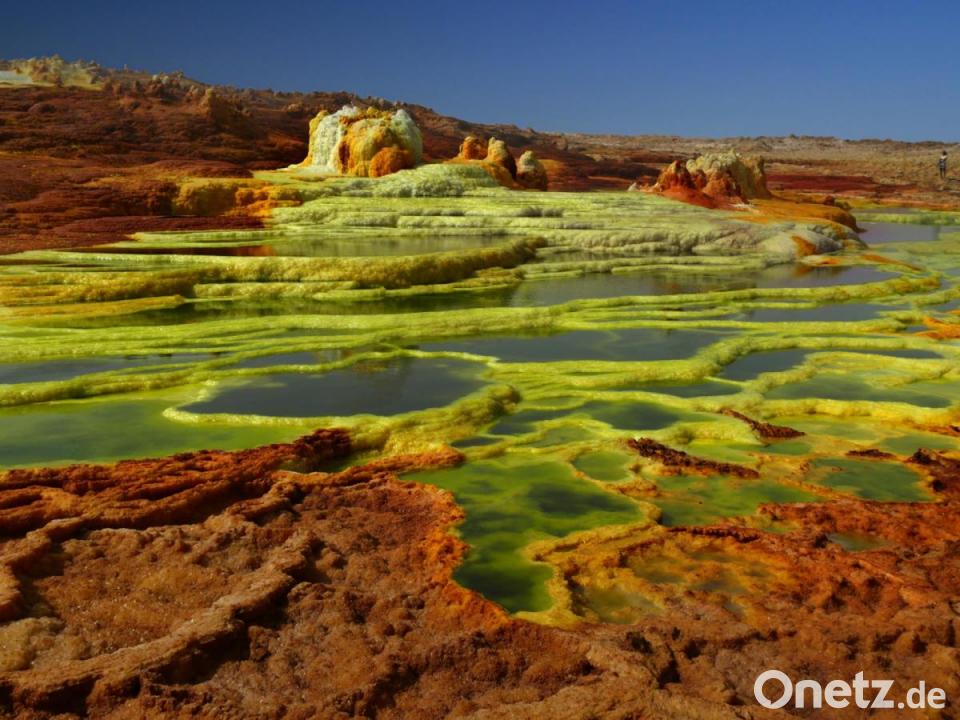 Von Dschibuti aus führte der Weg der Reisegruppe in die Wüste Danakil in Äthiopien mit dem erloschenen Vulkan Dallol. Die Salzebene ist eine der geologisch aktivsten Regionen der Erde mit mehreren Vulkanen und heißen Quellen, deren Wasser mit einer Temperatur von 70 Grad Celsius und einem extremen Säuregehalt austreten. Der enthaltene Schwefel und die verschiedenen Kaliumsalze sind verantwortlich für die intensiven Farben rund um die Austrittsstellen, die die Exkursionsteilnehmer faszinierten.