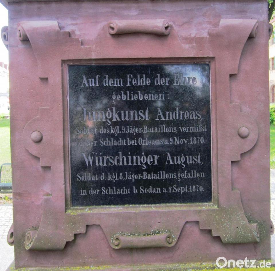 Das 1895 eingeweihte Kriegerdenkmal auf der Mitte des Marktplatzes in Vohenstrauß nennt zwei „tapfere Krieger, die auf dem Felde der Ehre“ verblieben. Auf der schwarzen Glasplatte ist eingraviert: „August Würschinger Soldat d. kgl. 8. Jäger- Bataillons gefallen in der Schlacht b. Sedan a. 1. Sept. 1870.“ Wie die Verlustliste aussagt, verstarb der 25 Jahre alte Krieger nach der Schlacht bei Sedan im Feldlazarett Bazeilles am 6. September 1870 an „durchdringender Brustschusswunde.“ Und das Denkmal erinnert an das zweite Vohenstraußer Opfer: „Jungkunst Andreas „Soldat b. kgl. 9. Jäger Bataillons vermisst in der Schlacht bei Orleans am 8.11.1870.“