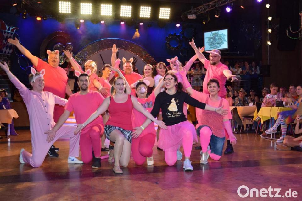 Frenetischen Applaus und laute Zugabe-Rufe bekam auch die Oldiegarde des VFV für ihren einzigartigen Auftritt: eine Zeitreise, die schwarz-weiß begann und ziemlich bunt endete. Einstudiert wurde dieser „Showact“ von Sabine Karl und Monika Zintl, denen die lustige Gruppe mit Blumen und Sekt dankte. Mit „Macarena“ lieferten die Oldies die gewünschte Zugabe und holten sich dafür Unterstützung aus den Reihen der Gäste – begeistert stieg die Band mit ein und verlängerte das Lied kurzerhand live um ein paar Takte, um dann übergangslos die nächste Stimmungstanzrunde einzuläuten.