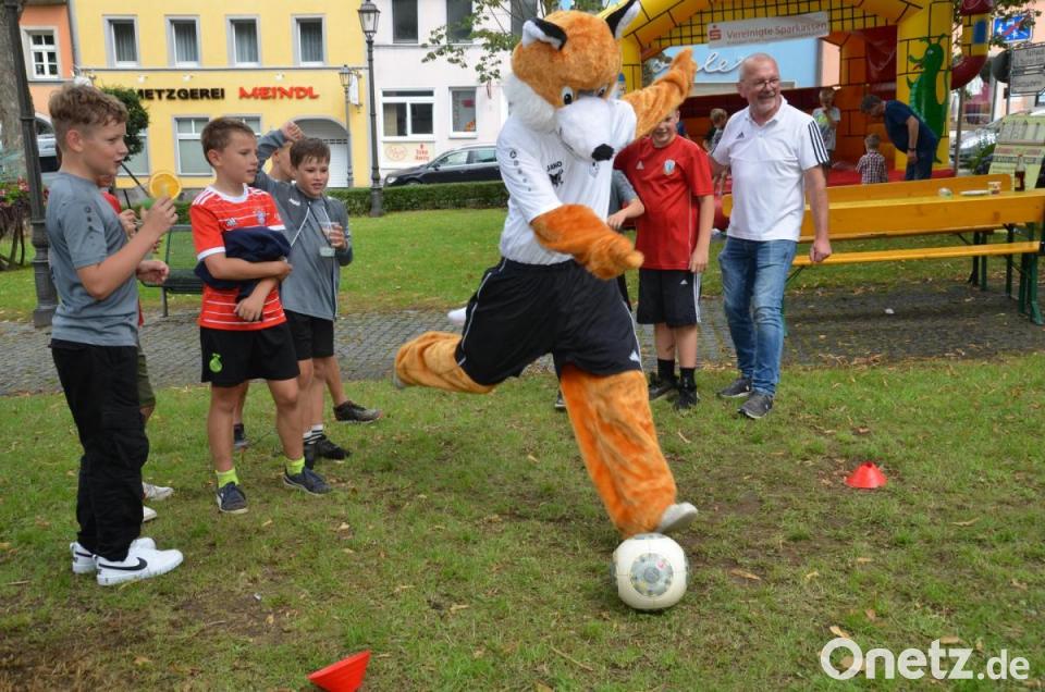Mit dem Fuchs wurde die Schussgeschwindigkeit eines jeden Mitspielers gemessen. Jeder Teilnehmer wollte natürlich die höchste Geschwindigkeit vorlegen, um den Fuchs zu imponieren. Im Soccer-Cage kämpften vor allem Buben um das runde Leder. Dagegen tummelten sich in der großen Sparkassen-Hüpfburg Buben und Mädels gleichzeitig und tobten sich so richtig aus. Gleichzeitig war auch noch ein Primus-Glücksrad vor Ort, das den glücklichen Gewinnern zu kleinen Preisen verhalf. Der Einsatz in Höhe von jeweils 50 Cent soll der Kinderkrebshilfe in der Region Oberpfalz Nord zur Verfügung gestellt werden, informierte Projektleiter Manfred Striegl, der mit seinem Kollegen Andreas Haag vor Ort war.