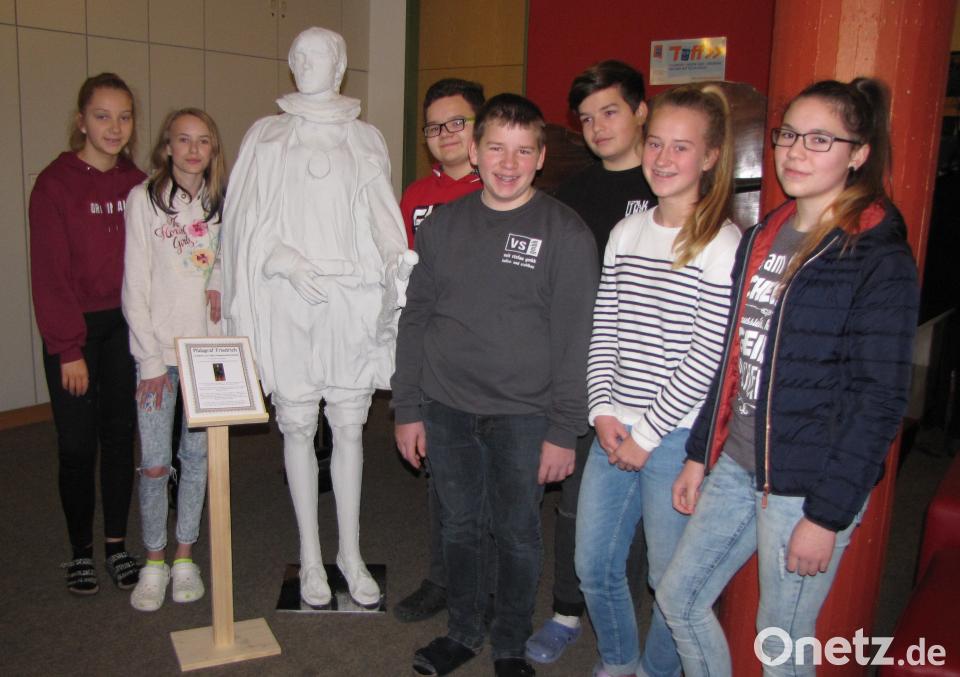 (dob) Wegen des bayerischen Doppeljubiläums - 100 Jahre Freistaat und 200 Jahre bayerische Verfassung - veranstaltete die Regierung der Oberpfalz einen Schulwettbewerb zum Thema "Wir feiern Bayern - Heimat leben und gestalten". Die Schüler der Klasse M 8 a der Pfalzgraf-Friedrich-Mittelschule legten sich dafür mächtig ins Zeug und ließen ihrer Kreativität freien Lauf. Zusammen mit Lehrerin Andrea Höllerer überlegten sie im Kunstunterricht und die Wahl fiel auf Pfalzgraf-Friedrich, den Namenspatron der Schule. Fieberhaft recherchierte und plante die Klasse, bevor die Schüler in den praktischen Teil mit Fachlehrer Wendelin Dürr einstiegen. Innerhalb von vier Wochen entstand so nach und nach die Gips-Statue des mittelalterlichen Herrschers.