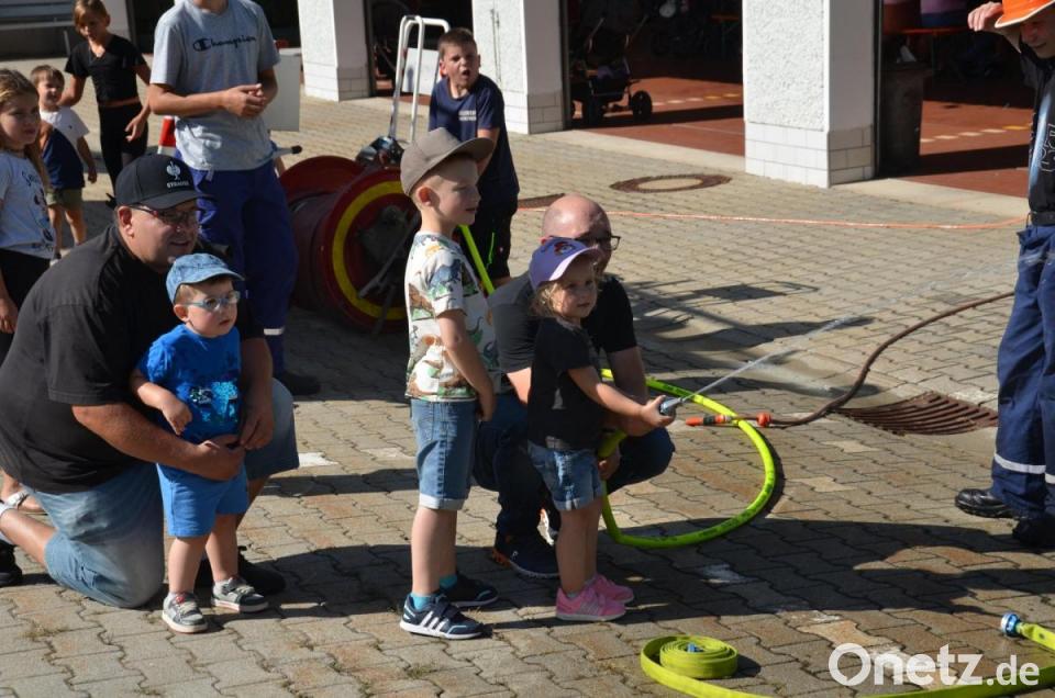Einen heißen Ferienaktions-Abschlusstag im wahrsten Sinne des Wortes erlebten die Mädchen und Buben heuer bei der Feuerwehr am Gerätehaus. Die Hitze von fast 30 Grad dürfte auch der Grund dafür gewesen sein, dass heuer weniger Kinder zu diesem Event kamen. Die Jugendvertreter der Wehr unter Leitung von Thomas Stahl hatten wieder allerhand Geschicklichkeitsübungen auf dem gesamten Gelände vorbereitet, bei dem die Kinder viel Fingerspitzengefühl beweisen mussten. So durften sie einen Tennisball per hydraulischem Rettungsspreizer transportieren oder mit der Kübelspritze versuchen, das brennende Haus zu löschen.