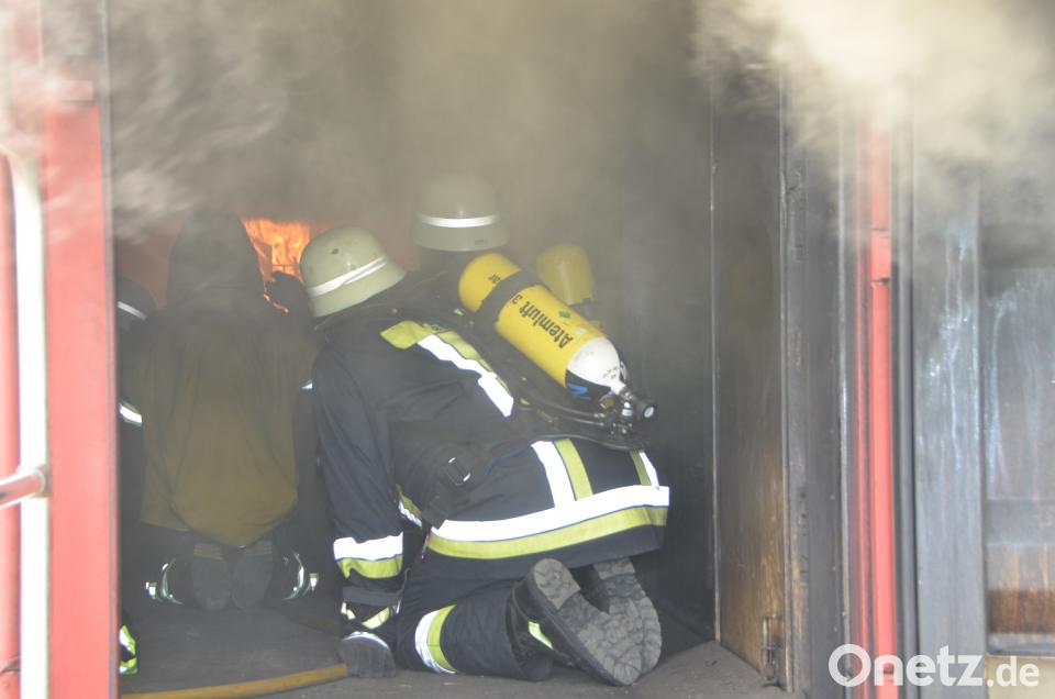 In den Raum strömte wieder Sauerstoff und das Feuer loderte sofort auf. Es war an der Zeit, Löschwasser in die Flammen zu spritzen und den Brandcontainer abzukühlen. Matthias Neumann stand bereits mit dem wasserführenden Tanklöschfahrzeug bereit. Die Trainingseinheiten vermittelten unter anderem, wie Brandverläufe erkannt und Gefahrensituationen richtig eingeschätzt werden können. Alle Teilnehmer hatten bereits ihre Grundausbildung als Atemschutzträger absolviert. Jetzt sollte die Übung im Brandschutzcontainer auch die nötige Praxis vermitteln.