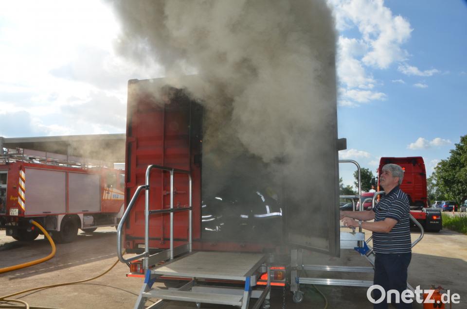 Stellvertretender Kommandant Albert Burger schloss während der Übung dann auch noch das große Tor des Containers. Somit konnte der dichte Qualm nicht mehr abziehen und quoll aus allen Ritzen hervor. Für die Insassen musste es ein beängstigendes Gefühl sein. Durch die geschlossene Tür wurde die Sauerstoffzufuhr unterbunden und das Feuer bekam keine Nahrung mehr. Dadurch entstand dichter Qualm, der komplett die Sicht verdeckte. Diese bedrückende Erfahrung sollten die Wehrleute einmal machen. Als es von innen an die Containerwand klopfte, machte Burger das Tor wieder auf. Damit stellte er eine ähnliche Situation her, als würde bei einem Brand in einer Wohnung die Zimmertür geöffnet.