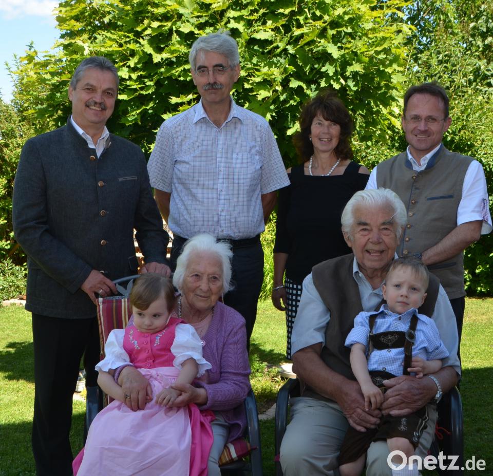 Heinrich Zelezny (vorne rechts) ist mit seinen 90 Jahren richtig lebensfroh und erfreut sich an vielen schönen Dingen. Die Urenkel Anna und Maximilian gratulierten ihrem Uropa ganz herzlich zum Ehrentag. Tochter Vera (hinten) schloss sich mit ihrem Lebenspartner den Glückwünschen von Bürgermeister Andreas Wutzlhofer (links) und Dekan Alexander Hösl (rechts) an.