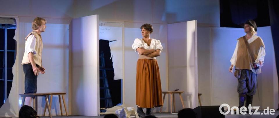 Dichter und Fechter Cyrano (Johannes Lukas) liebt seine Cousine Roxane (Mona Fischer). Doch statt selbst um sie zu werben, hilft der mit seinem Aussehen hadernde Gutmensch dem wenig beredten Soldaten Christian (Ole Bosse), die Schöne zu erobern. Aber auch der hinterhältige Graf de Guiche (Claudia Lohmann), der Roxane als Geliebte will, mischt eifrig mit. Das vierköpfige Ensemble des Landestheaters Oberpfalz (LTO) versetzt die gebannten Zuschauer mit intensivem Spiel in eine Welt der federleichten (Wort-)Duelle, eloquenten Spitzen und romantischen Verse. Mit der Mantel-und-Degen-Komödie, inszeniert von Till Rickelt, bringt das LTO im Kulturherbst sein "Corona-Stück" erneut auf die Bühne. Auf mehreren Ebenen mit trennenden Wänden angelegt, trifft das zugleich witzige und tragische Spiel mit Masken und Distanz damit genau die Aussage des Stoffs von Edmond Rostand. Verborgene Gefühle und Identitäten sorgen am Ende dafür, dass die platonische Ménage-à-trois zwischen Cyrano, Roxane und Christian trotz des Wirbels an kunstvollen Liebesschwüren in jeder Hinsicht unerfüllt bleibt. Und trotz allem – oder gerade deswegen – ist die Geschichte nicht aus der Zeit gefallen. Das Ideal an Humanität, das der selbstlose, tragische Held vermittelt, und auch die Botschaft, dass der äußere Schein wenig gegenüber der inneren Schönheit zählt, sind beständig gültig. Wie auch der stürmische Beifall bestätigt, mit dem die Zuschauer die Inszenierung belohnen.