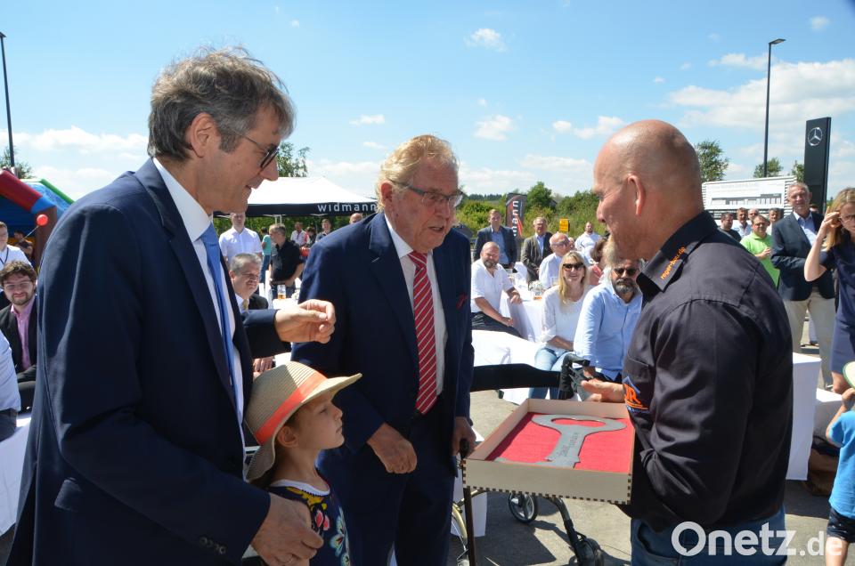 (dob) So kam es, dass das Autohaus Widmann umbaute. Vater Bruno sei, was Baumaßnahmen betrifft, ein richtiger Abenteurer und sofort Feuer und Flamme gewesen, erinnert sich Widmann. Neben dem Bau eines Rad- und Fußwegs entlang des Grundstücks gab die für Lkw günstige Lage an der Autobahn A 6 wohl den Ausschlag. Bernd Widmann zeigte sich nun bei der Eröffnung beeindruckt vom Neubau des Autohauses. Die ganze Aufmerksamkeit gehörte aber Senior und Firmengründer des deutschlandweit agierenden Mercedes-Benz-Händlers. Jener ist mit seinen über 90 Jahren Antrieb und Motor des familiengeführten Unternehmens. Nicht umsonst zog Juniorchef Bernd Widmann mit seinem dreijährigen Sohn Ben in aller Öffentlichkeit den Hut vor dem Vater und Opa.
