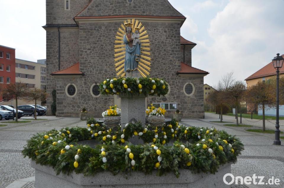 Der wunderschöne Marienbrunnen auf dem Platz vor der katholischen Stadtpfarrkirche erstrahlt, dank des katholischen Frauenbunds, zum Osterfest wieder in den herrlichen Farben Gelb und Weiß. Sie sind die farbenprächtigen Boten eines neuen Lebens, die auf das nahende Osterfest hinweisen. Passend zum Frühling zeigen wir die Symbol- und Heilkraft der Farben. Die gelb-weißen Eierketten ergänzen sich in den Farben der Stiefmütterchen in den bepflanzten Körbchen und vereinen sich zu einer lebendigen Symbiose. Das sonnige Gelb verbreitet nicht nur gute Stimmung und wenn dann die Gottesdienstbesucher nach der Osternacht in aller Herrgottsfrüh die Kirche verlassen, werden sie von dieser imposanten Pracht auf dem Kirchplatz begrüßt.