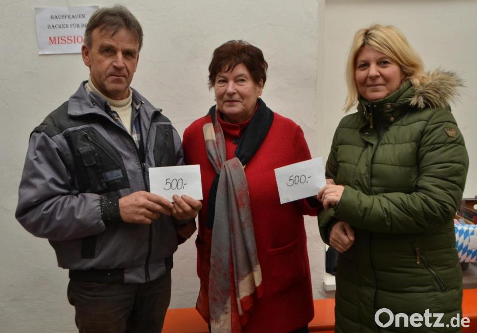 Der Riesenverkaufserfolg am Stand des Missionskreises im Erdgeschoß des „Advent im Schloss“ zeigte umgehend Wirkung. Damit Organisatorin Hildegard Busch das eingenommene Geld nicht lange auf dem Missionskreiskonto bei der Bank einzahlen brauchte, nutzte sie am Sonntagabend die Gunst der Stunde und reichte einen Teil des Erlöses gleich wieder an verschiedene Missionseinrichtungen weiter. Nachdem Richard Reger aus Böhmischbruck gleich in unmittelbarer Nähe ebenfalls einen Stand mit Drechselarbeiten betrieb, übergab Busch an den großen Unterstützer von Pater Ferdinand Bodensteiner aus Tröbes, der im Kongo wirkt, eine Spende in Höhe von 500 Euro. Weitere 500 Euro gibt Busch an die Missionskreishelferin Ingeborg Bock weiter. Sie wird die Spende an die Missionarinnen Christi weiterleiten. Schwester Barbara Kiener stammt aus Glaubendorf und braucht ebenfalls dringend Unterstützung aus der Heimat.