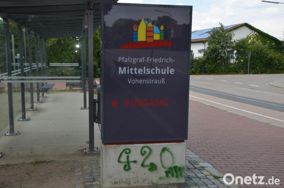 Vom Winklergarten aus ging es über die Wernberger Straße in Richtung Schulgebäude. An der Einmündung zur Straße „Hinter'm Schloß“ bemalten die Vandalen das Hallenbad-Hinweisschild und besprayten den Sockel des „Pfalzgraf-Friedrich-Mittelschule“ Emblems. In gleicher Weise verzierten sie mit den Kürzeln einen Altpapier-Container am Eingang zum Sportzentrum.